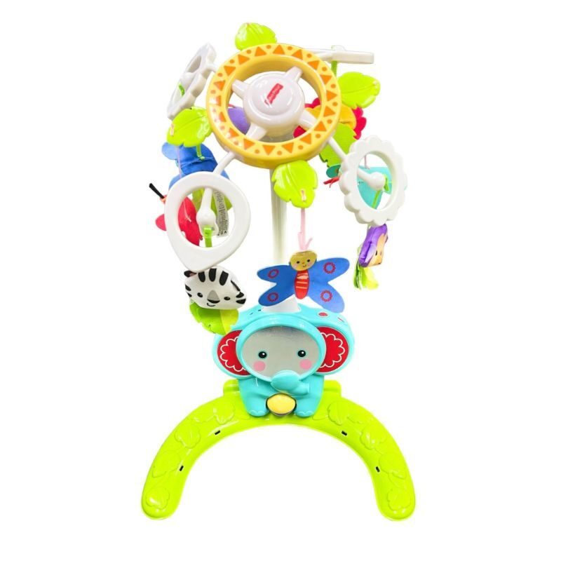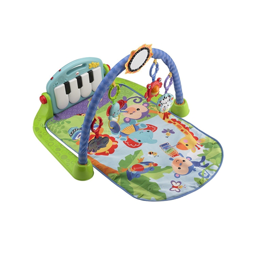 サルの歯固めやキリンのラトルなど6種類のおもちゃがセットになった、ベビージムです。セットのおもちゃが0歳児の好奇心をくすぐり、自然な全身運動を促すことで、身体機能の成長を助けます。