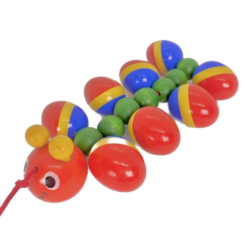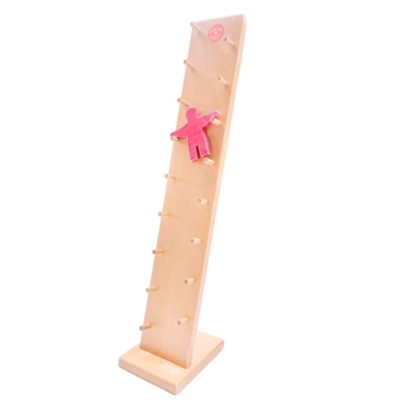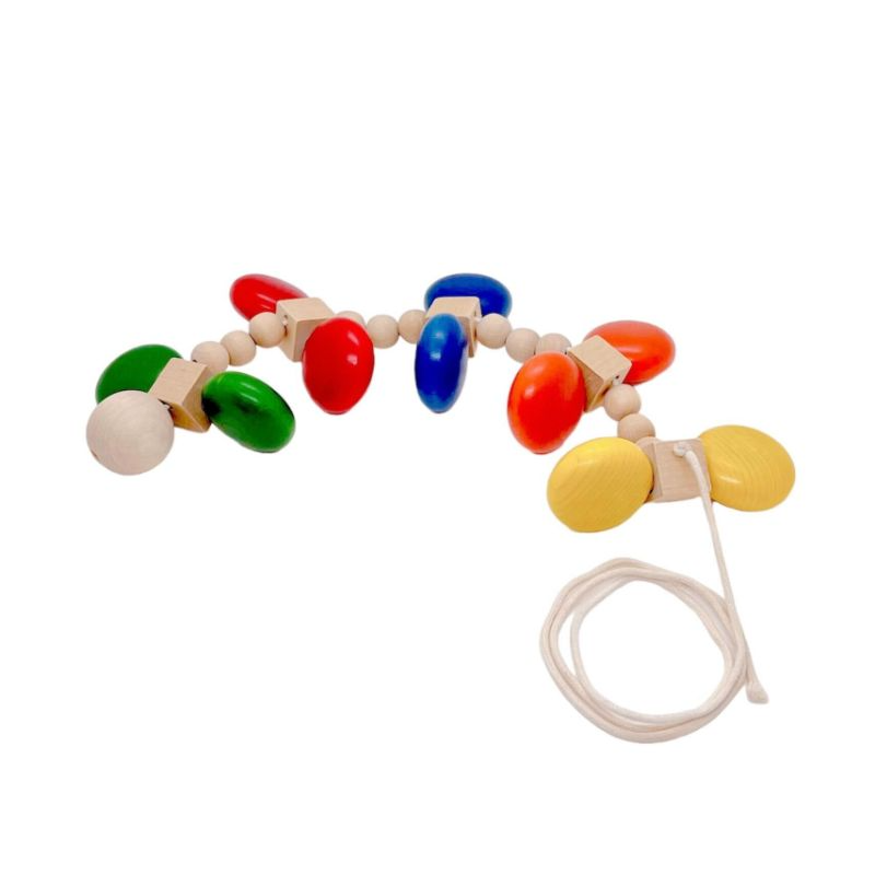 日本の職人が削った国産木材に塗料を塗って作られた、おしゃれなタワー形ラトルです。上下逆さまにひっくり返すとリズミカルな音とともに木玉が落ちて、子どもの関心を引きつけます。子どもの目の前で横に転がし、追いかけさせると、ハイハイ・あんよを促します。