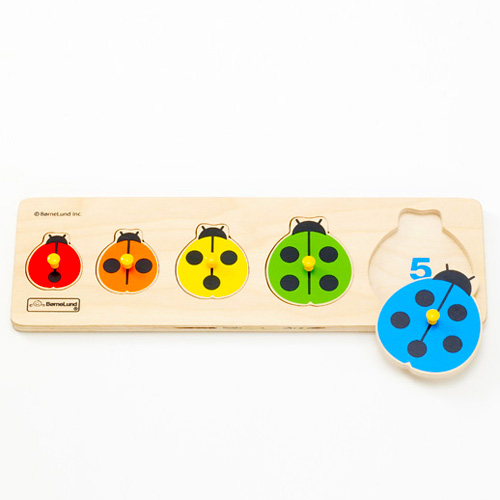 指先遊びに欠かせないピックアップパズル。てんとう虫の背中に描かれているほしの数と同じ数字が下に隠れています。また、下に描かれた数字はてんとうむしの背中の色と同じ色になっています。大きさを比べたり、数をかぞえたり、数字や色の認識など、幅広い月齢のお子様に遊んでいただけるパズルです。最初は1つずつ大人の方と一緒にピースをはめる練習をするのがオススメです。向きを変えないようにそっと外したピースをお子様に持たせてあげ、はめる場所を教えてあげてください。慣れてきたら向きを少しずらし、形を合わせる練習を。向きを変えても入れられるようになってきたら、全てのピースを外し、パズル台の側に並べ、お子様が自分で取って該当する箇所にはめる練習をします。このように段階を踏んで遊ぶことでお子様の成功体験が少しずつ積み重ねられ、やる気が引き出されていきます。