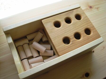 穴の中に棒を入れると「コトン!」と木の美しい音が響きます。大変良質な、国産の木製玩具を作っている同社は皇室御用達とも言われ、箱は栃の木、ふたはケヤキや桜の広葉樹材を使っています。同じことを何度も何度も繰り返すことで、お子様の集中力を高め、心に充足感を与えてくれます。