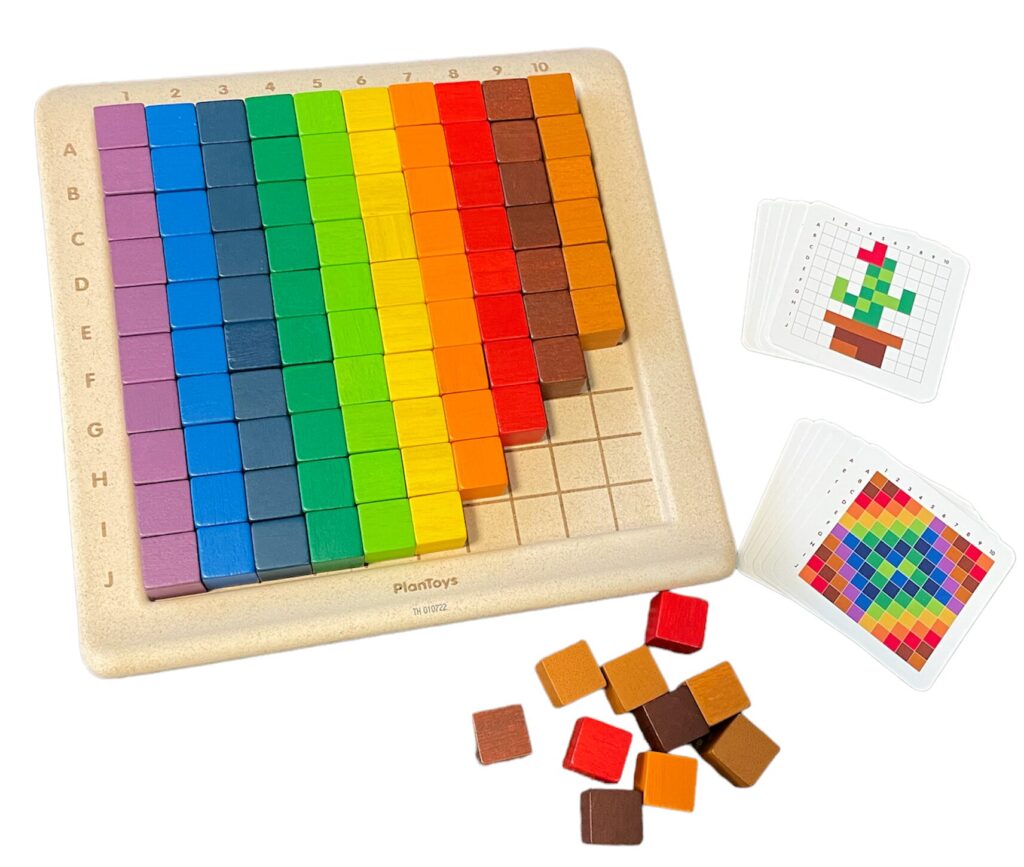 カラフルなキューブ100個を使ってモザイク遊びを楽しみましょう。プレイカードで遊びの幅が広がります。まずは、カードの絵を参考にキューブを並べて作品を作りましょう。色を変えたり、キューブを足したり、オリジナル作品作りにも挑戦!また、カード裏面に記載されているカラーコーディングを元に、キューブを並べましょう。どんな作品が完成するかな?遊びながら想像力・思考力を育みます。
