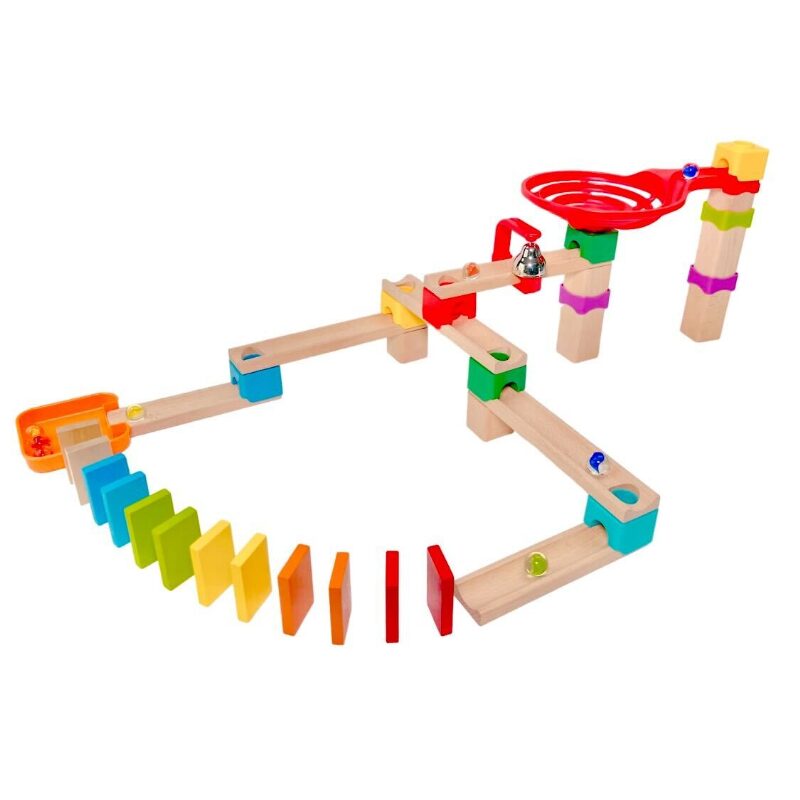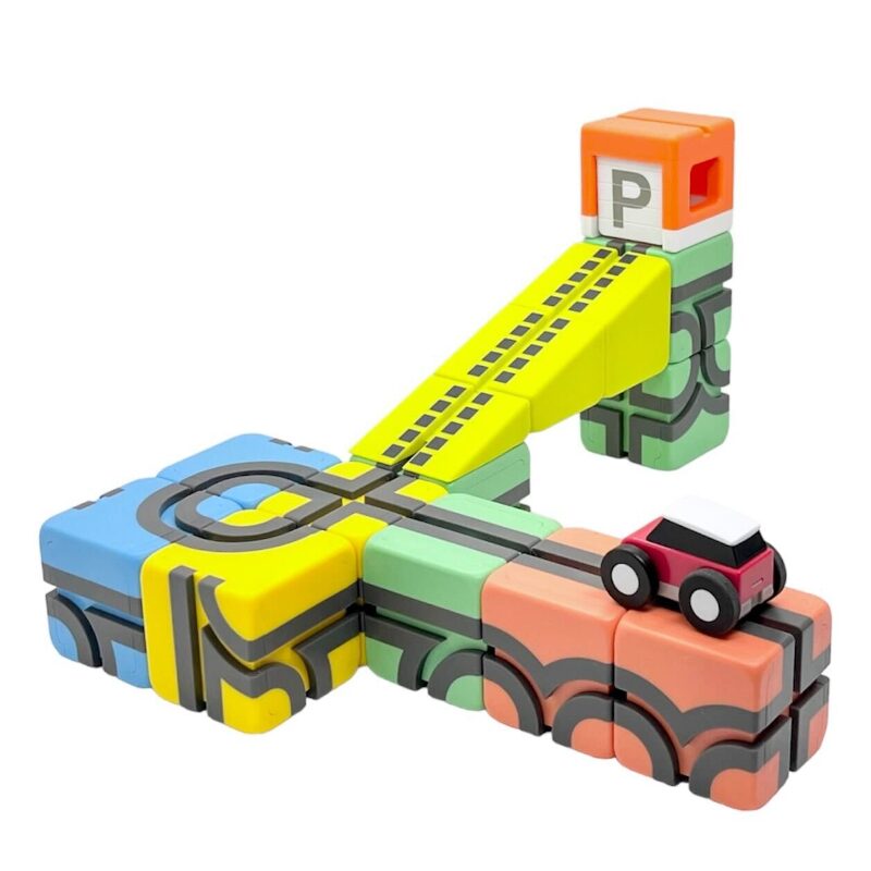 指定されたピースを使って道を作り、ボールを載せたゼンマイ仕掛けの車を走らせて遊びます。無事にゴールにたどり着くとボールが穴に落ちる点も、子ども心をくすぐるおもしろい特徴です。