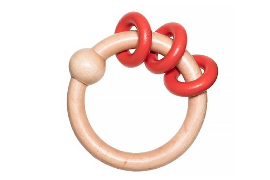 国産のカエデ材に珊瑚色のリングをあしらったベビー用ラトル。小さな手で握りやすいよう持ち手部分を極限まで細くし、軽やかさと心地よい手触りにこだわりました。赤ちゃんが初めて認識すると言われ、追視しやすい赤色を差し色に。「森と海の恵みを受けて幸せいっぱいに育って欲しい」そんな想いを込めました。