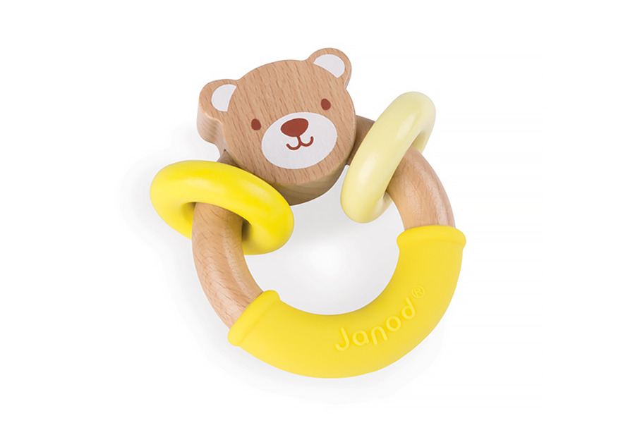 フランスで生まれたベビー&キッズの木製トイブランド「ジャノー」のベビー用ラトル。フレンチポップなイエローカラーが特徴的なこのおもちゃは、赤ちゃんが舐めても安心安全な木とシリコンでできているので、歯が生えてきた赤ちゃんにピッタリ!振ったりお口に入れて、異なる感触をお楽しみください。